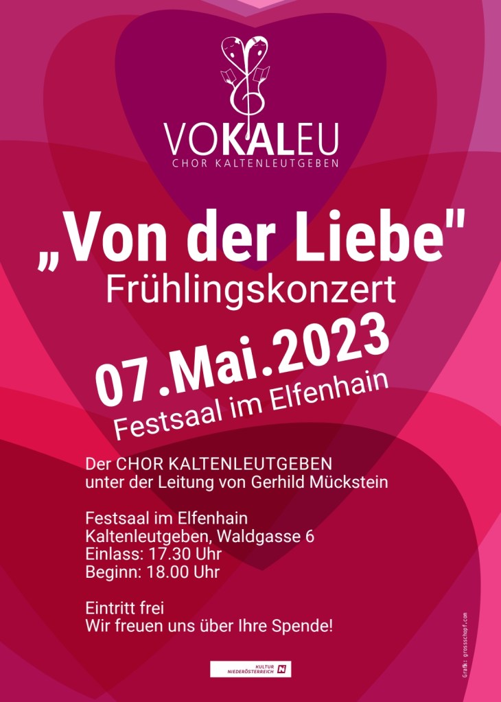 Dann werden wir essen und danach beim Stammtisch zuerst die beiden Liebesjodler „Aba Suserl, du g’herst mein“ und den „Schweinsbeuschler – Dui, dui, dui“ singen und üben. Denn diese beiden Jodler werden am Sonntag, 7. Mai in Kaltenleutgeben beim Konzert „Von der Liebe“ gesungen – von sechs Leuten aus unserer Perchtoldsdorfer Jodelgruppe.