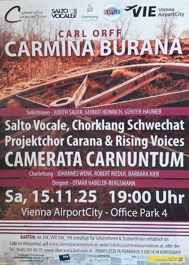 Für den Samstag, 15. November darf ich euch herzlich in ein Konzert an einem außergewöhnlichen Ort einladen: Wir singen die Carmina Burana am Flughafen Schwechat!