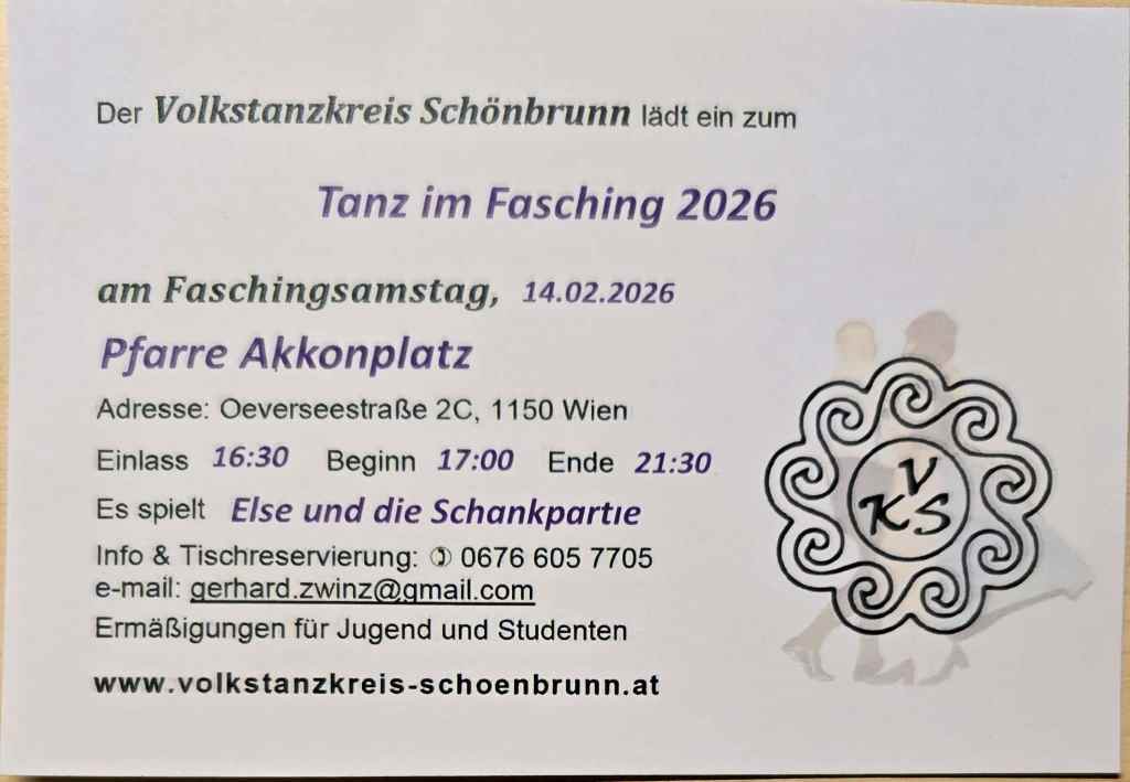 * Samstag, 14. Februar Tanz im Fasching 17.00 – 21.30 Pfarre Akkonplatz mit Singen und Jodeln als Pauseneinlage, siehe die Einladung hier unten